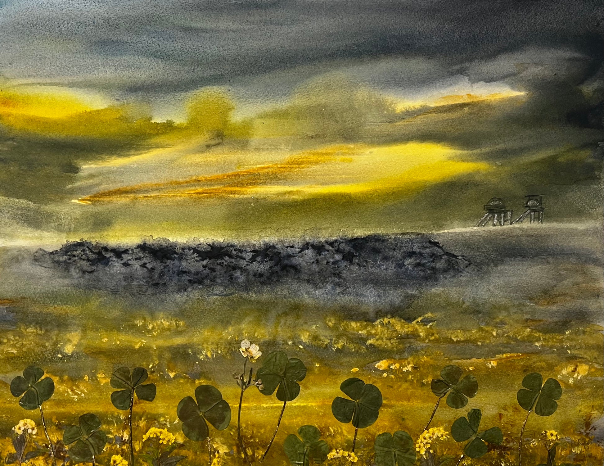 Watercolour, using dried four leaf clovers and dried yellow flowers